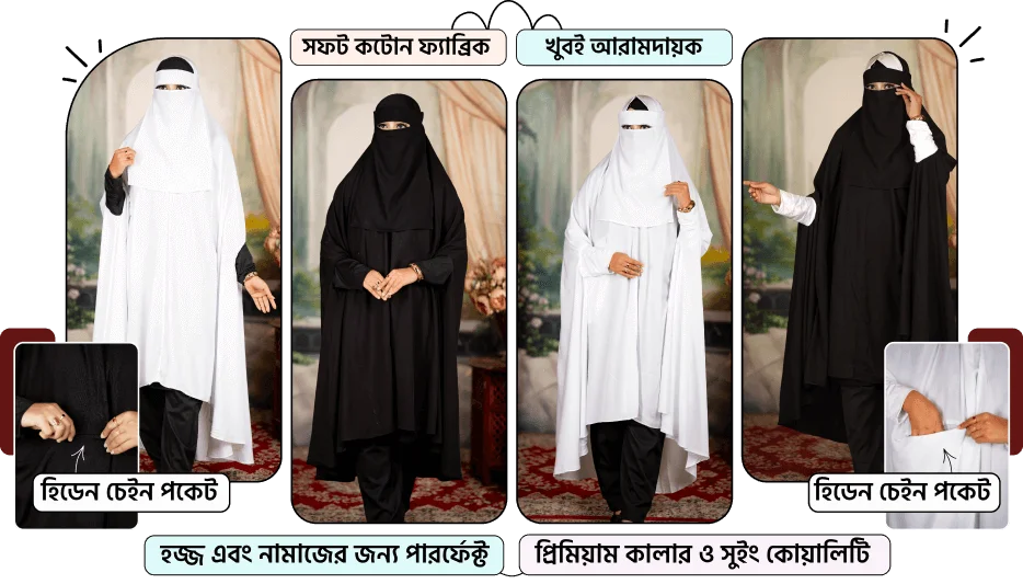 নিকাব সহ ওমরাহ্ সালাত হিজাব—লম্বা মাথা থেকে সামনে ৫২” পেছনে ৫৮” চাইনিজ লিলেন সফট কটন ফ্যাব্রিকে তৈরি, এবং মাথায় আর হাতে পাবেন চাইনিজ স্ট্রেচ ফেব্রিক, হিজাব-টিতে একটি হিডেন চেইন পকেট পাবেন।